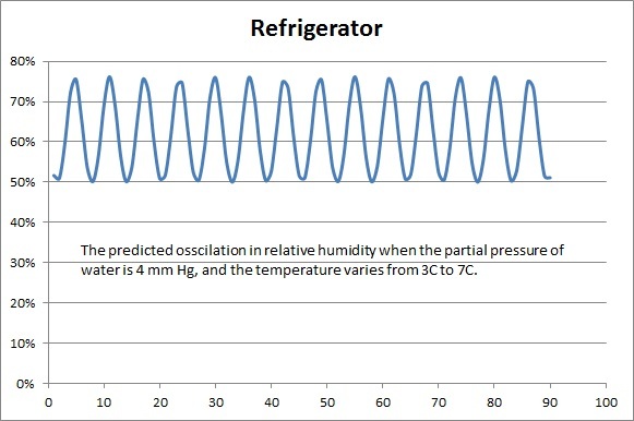 We tested this in one of our refrigerators at RMC, and found the actual situation to be a little worse, an amplitude of about 40%. The amount of water in the air in our 13.75 ft3 refrigerator is 1.65 grams. That’s quite a bit of water in the air, but a relative humidity profile that seems more or less uncontrollable.